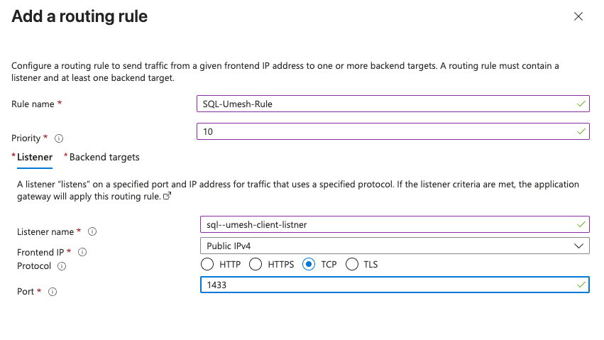 Select TCP or TLS as the listener protocol and define the incoming port (e.g., 1433 for SQL).