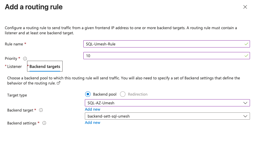 Associate the listener with backend settings to complete the rule.